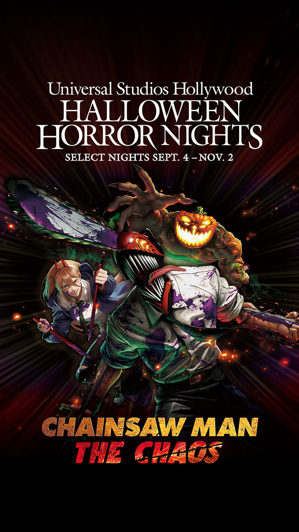 “Chainsaw Man: The Chaos” makes its Hollywood debut exclusively at Universal Studios Hollywood’s Halloween Horror Nights within the DreamWorks Theatre. This all-original horror anime short film arrives directly from Universal Studios Japan based on the popular Japanese manga and anime series streaming now on Crunchyroll. The film will play in-language and recounts the tale of Denji and the Devil Hunters as they battle the Halloween Horror Nights Devil and his army of zombies. Denji, resurrected into Chainsaw Man, a devil-human hybrid with protruding chainsaws from his body, ultimately takes control in a quest to combat the Devils. It’s an extreme showdown that dares guests to survive a chaos of screams and blood.