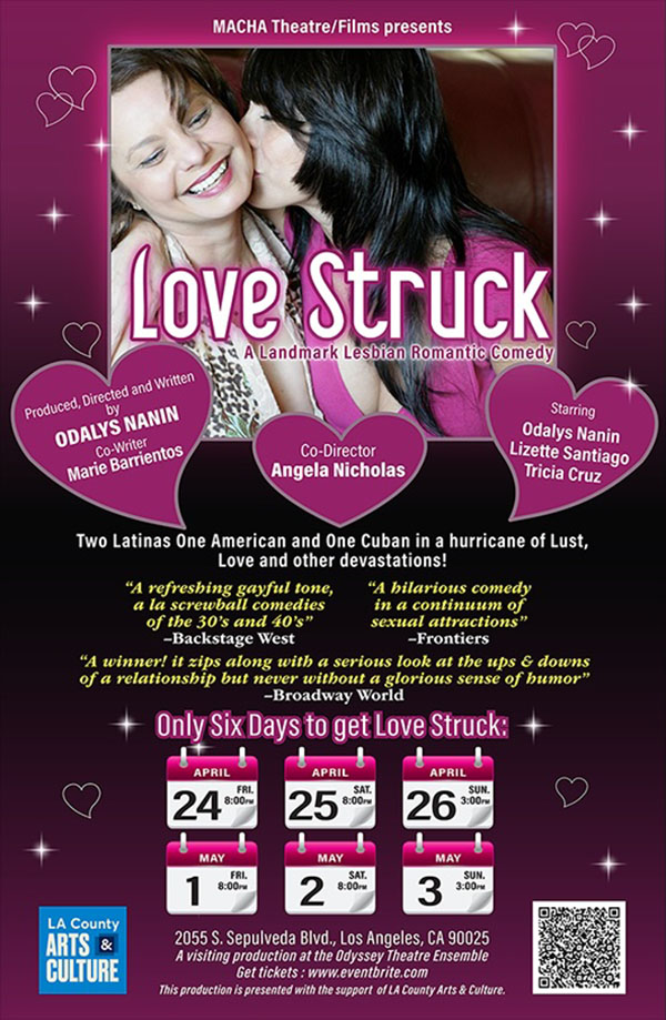 “Love Struck” Two Latinas, one American and one Cuban, in a hurricane of lust, love, and other devastations. Rachel, the American, and Laura, the Cuban, have been together for three years. The white-hot lust of their early courtship has evolved into a warm domesticity, They energize their love life with role-playing, cosplay, and erotic accessories. Laura, the more successful of the two, has bought a comfortable Los Angeles home where they reside. Rachel wants to become as accomplished as Laura. Rachel is also beginning to feel homesick for her native New York. Will love keep them together? Written by Odalys Nanin and Marie Barrientos, and directed by Odalys Nanin and Angela Nicholas, it runs April 24 through May 3 at the Odyssey Theatre in Los Angeles. For tickets call 310-477-2055 or visit www.eventbrite.com/e/love-struck-tickets-66479031573.