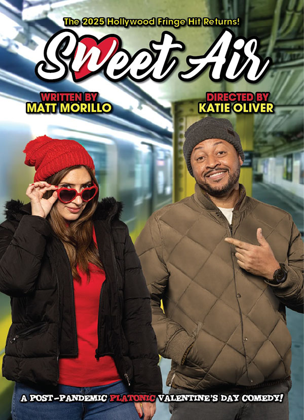 “Sweet Air” Robbie and Galen, two complete strangers on completely different paths in life, have both had a miserable Valentine’s Day. They’re both broke, lonely and stranded in a deserted subway station on a freezing cold New York City night, waiting for a train that never seems to be coming. With seemingly nothing to lose, they strike up a conversation, commiserate, bond, unravel the mysteries of the universe and romantic comedies and find a connection in this cruel and heartless world in this post-pandemic, platonic Valentine’s Day comedy. Written by Matt Morillo, and directed by Katie Oliver, it runs January 23 through February 15 at the McCadden Place Theatre in Hollywood. For tickets visit www.sweetairplay.com.