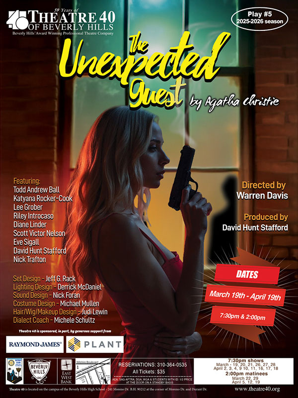 “The Unexpected Guest” Lost in the fog, a stranger seeks refuge in a nearby house, only to find a man shot dead and his wife standing over him with a smoking gun. But the woman’s dazed confession is anything but convincing, and the unexpected guest decides to help. Remarkably, the police clues point to a man who dies two years previously, but as the ghosts of a past wrong begin to emerge, a tangled web of lies reveals family secrets and chilling motives, where the real murderer turns out to be the greatest mystery of all. Written by Agatha Christie, and directed by Warren Davis, it runs March 19 through April 19 at the Theatre Forty, in the Mary Levin Cutler Theatre in Beverly Hills. For tickets call 310-364-0535 or visit theatre40.org.