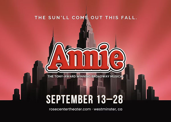 “Annie” a spunky Depression-era orphan, determined to find her parents, who abandoned her years ago on the doorstep of a New York City Orphanage run by the cruel, embittered Miss (Agnes) Hannigan. In adventure after fun-filled adventure, Annie foils Miss Hannigan’s evil machinations, befriends President Franklin Delano Roosevelt and finds a new family and home in billionaire Oliver Warbucks, his personal secretary Grace Farrell, and a lovable mutt named Sandy. Written by Thomas Meehan, with music by Charles Strouse, lyrics by Martin Charnin, and directed by Tim Nelson, it runs September 13 through September 28 at the Rose Center Theater in Westminster. For tickets call 714-793-1150 or visit www.rosecentertheater.com/annie.