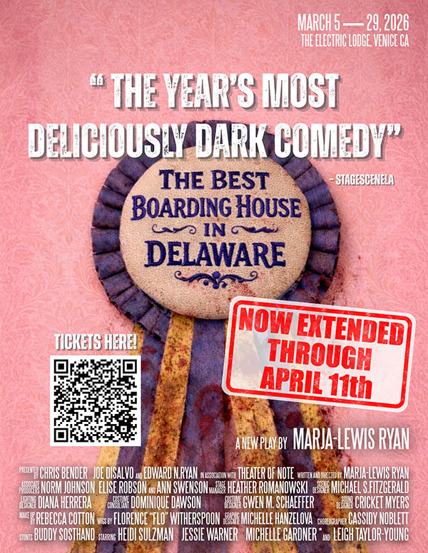 “The Best Boarding House in Delaware” Inspired by the chilling true crimes of Dorothea Puente—who ran a social security scam out of her boarding house for seniors—The Best Boarding House in Delaware explores themes of trust, vulnerability, and survival. Ryan brings her signature emotional depth and human insight to a story that amounts to a haunting warning about the invisibility of older women in this country. Written and directed by Marja-Lewis Ryan, it runs through April 11 at the Electric Lodge Theater in Venice. For tickets visit thebestboardinghouseindelaware.eventbrite.com.