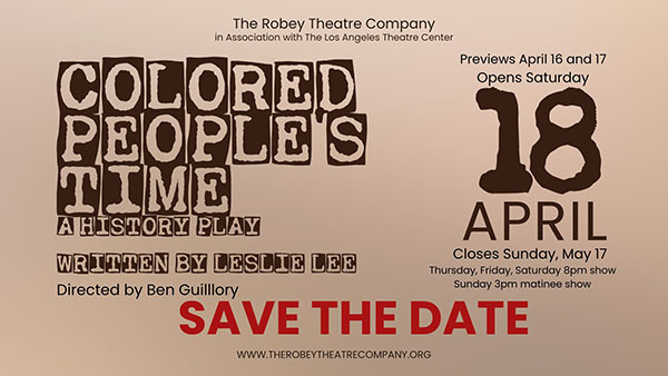 “Colored People’s Time: A History Play” The clock ticks…Time moves forward….and so do we. From the end of the Civil War to the beginnings of Jim Crow, we witnessed the grit and resilience of Colored people who simply had no choice but to make the most of living the fear, pain and joy of being Black in America. They found the tenacity and fortitude to win the small everyday battles that allowed them to simply get through another day. Freemen and Women with hope and faith in each other were able to not just survive but triumph when all odds were against them. The heroes like Marcus Garvey and Joe Louis were cause for celebration; Sistas like unknown Nadine, dying of tuberculosis, unable to find the means to get to the hospital herself for treatment, yet finding the empathy to give room so another man does not find himself destitute and in the streets. Then, there’s Alberta and Belle, one puttin’ down the funk to be able to pay the rent, the other to entertain fighting Black men intent on letting this country know we are ready, willing, and able to fight for this country even though this country is fighting tooth and nail to deny them human rights. The clock ticks and we witness the everyday experience of Colored people who through it all are compelled to become the unintended heroes that live through Colored People’s Time. Written by Leslie Lee, and directed by Ben Guillory, it runs April 18 through May 17 at the Los Angeles Theatre Center in Los Angeles. For tickets visit therobeytheatrecompany.org.