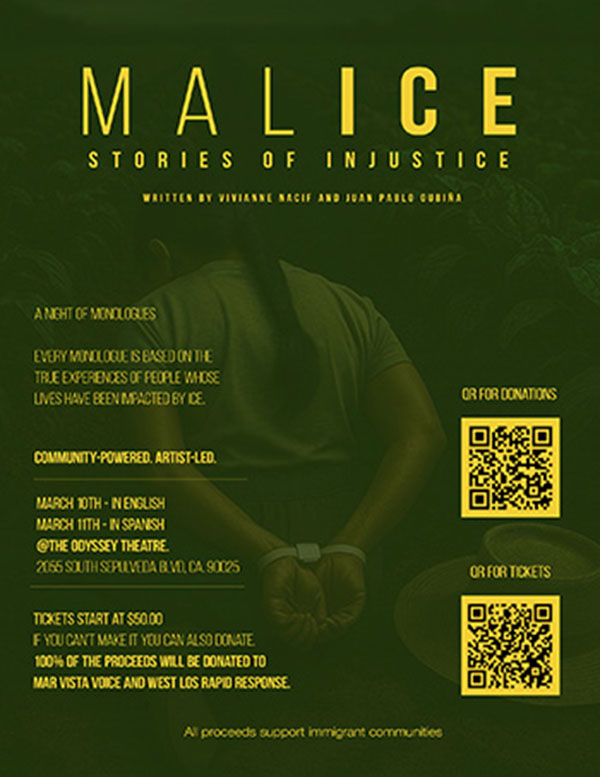 “MALICE: Stories of Injustice” a series of monologues inspired by true stories of families and communities affected by ICE. Tuesday night will be performed in English, Wednesday night will be performed in Spanish. Written by Vivianne Nacif and Juan Pablo Oubina, and directed by Vivianne Nacif, it runs March 10 through March 11 at the Odyssey Theatre in West Los Angeles. For tickets call 310-477-2055 Ext. 2 or visit OdysseyTheatre.com