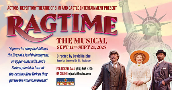 “Ragtime the Musical” At the dawn of a new century, everything is changing… and anything is possible. Set in the volatile melting pot of turn-of-the-century New York, three distinctly American tales are woven together – that of a stifled upper-class wife, a determined Jewish immigrant and a daring young Harlem musician – united by their courage, compassion and belief in the promise of the future. Together, they confront history’s timeless contradictions of wealth and poverty, freedom and prejudice, hope and despair… and what it means to live in America. With a Tony Award-winning score which blends ragtime, blues, jazz and show tunes, it’s a powerful, sweeping saga of America! Written by Terrence McNally, with music by Stephen Flaherty, lyrics by Lynn Ahrens, and directed by David Ralphe, it runs September 12 through September 21 at the El Portal Theatre Debbie Reynolds Mainstage in North Hollywood. For tickets call 818-508-4200 or visit www.elportaltheatre.com.