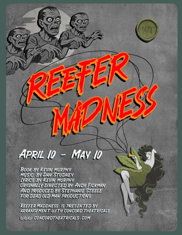 “Reefer Madness” Inspired by the original 1936 film of the same name, this raucous musical comedy takes a look at the mass hysteria caused when two clean-cut kids, Jimmy and Mary, fall prey to the frightful toll of the new drug menace currently destroying the youth of America in alarmingly increasing numbers, the insidious and murderous lure of our real public enemy number one, MARIJUANA! It tragically (and hysterically) leads them both into a downward spiral filled with wild jazz, chaos and mayhem, lurid sex and uncontrollable violence. Written by Kevin Murphy & Dan Studney, with music by Dan Studney, lyrics by Kevin Murphy, it runs April 10 through May 10 at the Wisteria Theater in North Hollywood. For tickets call 818-237-4643 or visit www.wisteriatheater.com.