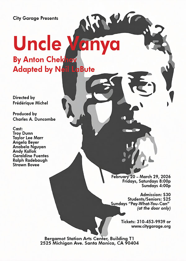 “Uncle Vanya” Set in a rural estate at the end of the 19th century, the lives of Vanya, his niece Sonya, the retired Professor Serebryakov and his young wife Yelena intertwine, leading to complex jealousies, romantic rivalries, and emotional breakdowns as they confront their wasted lives and failed dreams. Vanya and Astrov, a local doctor, both fall in love with Yelena, a spoiled, self-centered beauty; Sonya pines hopelessly for the doctor, while the oblivious Professor disrupts everyone’s lives with his egotistical demands. This classic play, rendered here by LaBute in a new, contemporary version, uses deceptively ordinary dialogue to reveal deep human frailties and a poignant, yet hopeful message about how we find the strength to endure life’s struggles. Written by Neil LaBute, and directed by Frédérique Michel, it runs February 20 through March 29 at the City Garage in Santa Monica. For tickets visit ticketleap.events/tickets/city-garage/uncle-vanya.